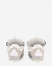 The Curb is a sneaker inspired by the 90s, with a confident design and exaggerated dimensions. Made in nappa calfskin, suede and mesh, this elaborately constructed shoe stands out for its extraordinary comfort thanks to the rounded shape, padded tongue, and curved metallic eyelets. Details - Leather Curb sneakers - Color: Gray, White - Quilted tongue with Lanvin label and embossed Mother and Child logo - Double waxed and woven herringbone laces - Mottled soles - Made in Portugal Composition - Main material: 100% calfskin - Material 2: 100% calfskin - Material 3: 100% polyester weave - Lining: 82% polyester weave and 18% Elastane - Sole: Rubber Cleaning and care - Clean gently with a soft cloth or bristled brush without products. - Store in a dry, dark place in its original packaging. SKU: FM-SKRK11-DOTS-P23130041