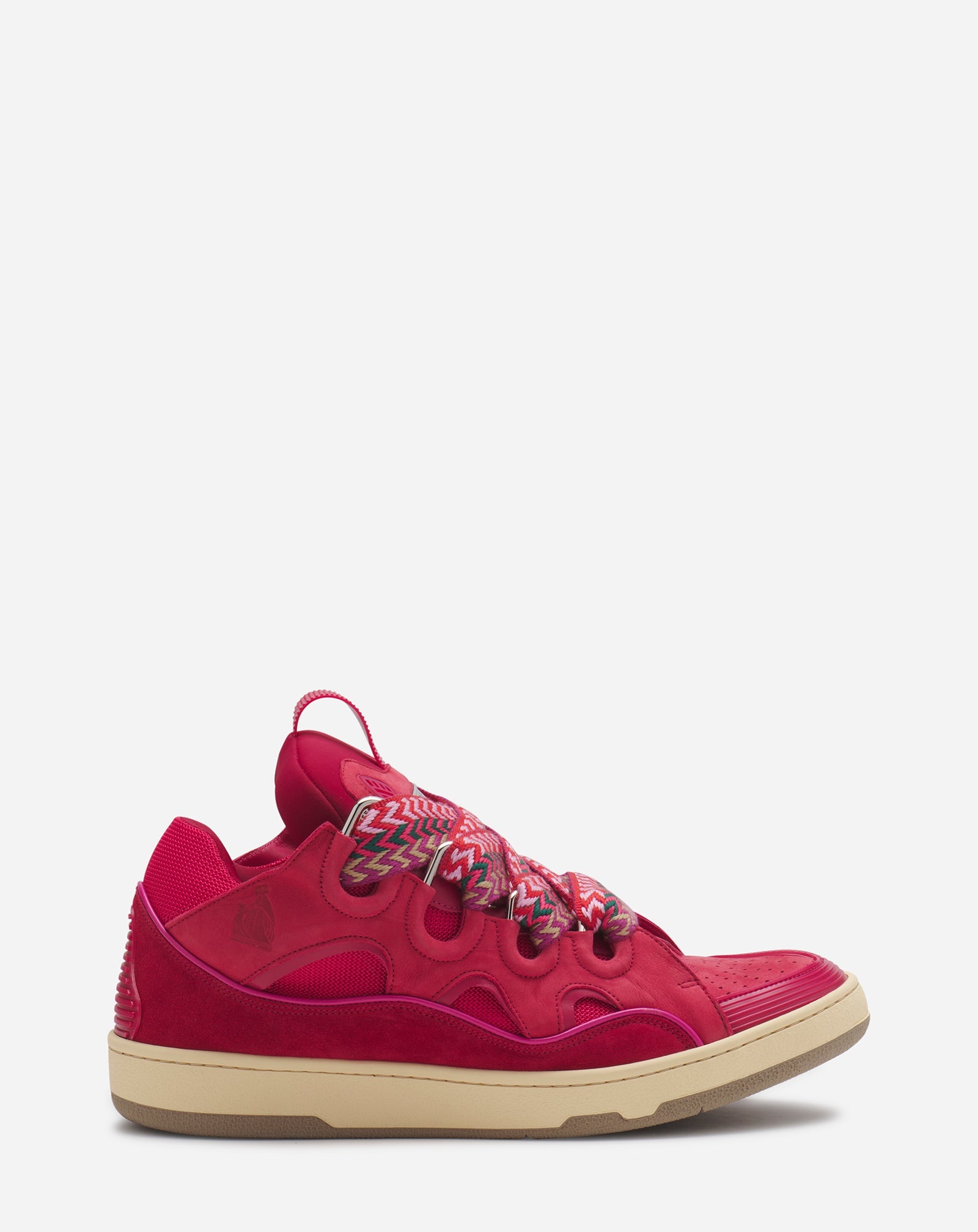 The Curb is a sneaker inspired by the 90s, with a confident design and exaggerated dimensions. Made in nappa calfskin, suede and mesh, this elaborately constructed shoe stands out for its extraordinary comfort thanks to the rounded shape, padded tongue, and metallic eyelets. Details - Leather Curb sneakers - Color: Watermelon - Made in Portugal Size and fit - Quilted tongue with Lanvin label and embossed Mother and Child logo - Double waxed and woven herringbone laces Composition - Main material: Calfskin - Material 2: Calfskin - Material 3: Woven polyester - Lining: 82% woven polyester, 18% Elastane - Sole: Rubber Cleaning and care - Clean gently with a soft cloth or bristled brush without products. - Store in a dry, dark place in their original packaging. SKU: FM-SKRK11-DRAG-A2359439