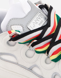 The Curb is a sneaker inspired by the 90s, with a confident design and exaggerated dimensions. Made in nappa calfskin, suede and mesh, this elaborately constructed shoe stands out for its extraordinary comfort thanks to the rounded shape, padded tongue, and curved metallic eyelets. Details - Curb sneakers in nubuck, calfskin leather and reflective material - Color: white - Quilted tongue with Lanvin label and embossed Mother and Child logo - Double waxed and woven laces - Made in Portugal Composition - Main material: mesh - Secondary material: calfskin - Third material: nubuck - Fourth material: reflective material - Sole: rubber Cleaning and care - Clean gently with a soft cloth or bristled brush without products. - Store in a dry, dark place in its original packaging. SKU: FM-SKRK11-REFL-P220039