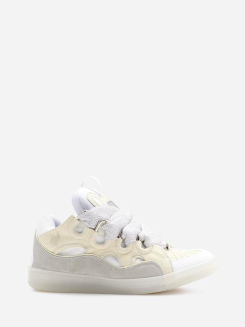 The Curb is a sneaker inspired by the 90s, with a confident design and exaggerated dimensions. Made in nappa calfskin, suede and mesh, this elaborately constructed shoe stands out for its extraordinary comfort thanks to the rounded shape, padded tongue, and curved metallic eyelets. Details - Leather Curb sneakers - Color: Taupe - Quilted tongue with Lanvin label and embossed Mother and Child logo - Double waxed and woven herringbone laces - Transparent sole - Made in Portugal Composition - Main material: 100% calfskin - Material 2: 100% polyester weave - Material 3: 95% TPU and 5% polyurethane - Lining: 82% polyester weave and 18% Elastane - Sole: Rubber Cleaning and care - Clean gently with a soft cloth or bristled brush without products. - Store in a dry, dark place in its original packaging. SKU: FM-SKRK11-TRAG-P231639
