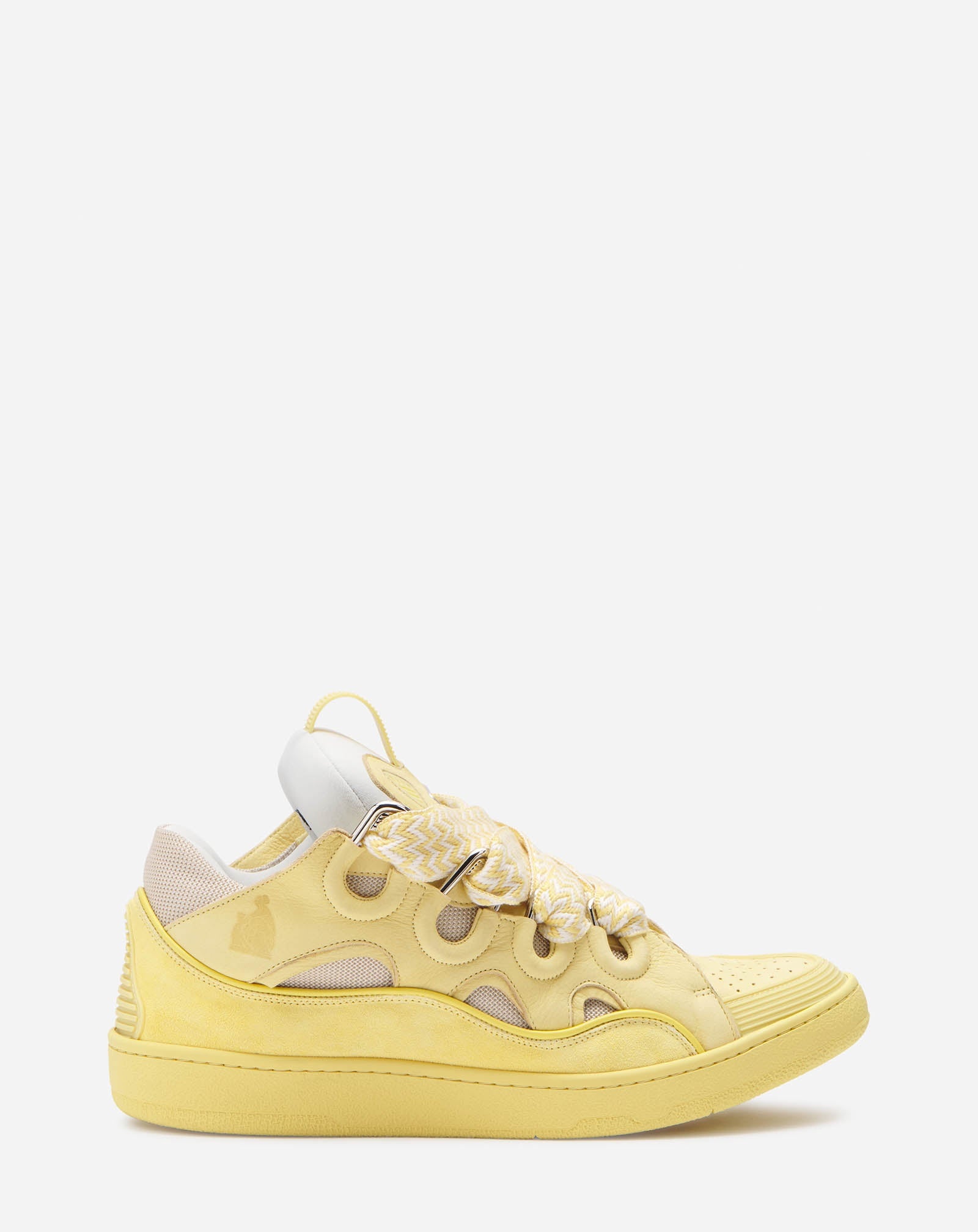 The Curb is a sneaker inspired by the 90s, with a confident design and exaggerated dimensions. Made in nappa calfskin, suede and mesh, this elaborately constructed shoe stands out for its extraordinary comfort thanks to the rounded shape, padded tongue, and metallic eyelets. Details - Leather Curb sneakers - Color: Corn - Made in Portugal Size and fit - Quilted tongue with Lanvin label and embossed Mother and Child logo - Double waxed and woven herringbone laces Composition - Main material: 100% calfskin - Material 2: 100% calfskin - Material 3: 100% polyester weave - Lining: 82% polyester weave and 18% Elastane - Sole: Rubber Cleaning and care - Clean gently with a soft cloth. - Store in a dry, dark place in their original packaging. SKU: FM-SKRK11-DRUC-E2381039