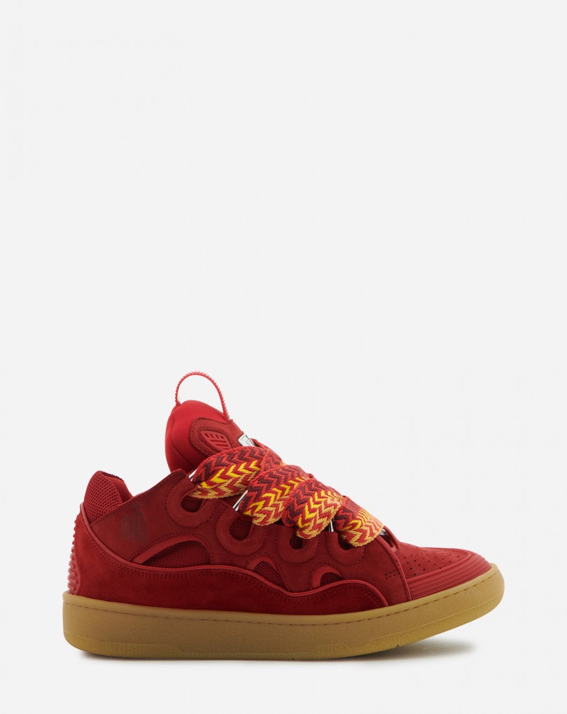 The Curb is a sneaker inspired by the 90s, with a confident design and exaggerated dimensions. Made in nappa calfskin, suede and mesh, this elaborately constructed shoe stands out for its extraordinary comfort thanks to the rounded shape, padded tongue, and curved metallic eyelets. Details - Curb sneakers in nappa calfskin, suede and mesh - Color : POPPY RED red - Quilted tongue with Lanvin label and embossed Mother and Child logo - Double waxed and woven herringbone laces - Made in Portugal Composition - Main material: mesh - Material 2: calfskin - Material 3: nubuck - Sole: rubber Cleaning and care - Clean gently with a soft cloth or bristled brush without products. - Store in a dry, dark place in its original packaging. FM-SKRK11-DRAG-E2237