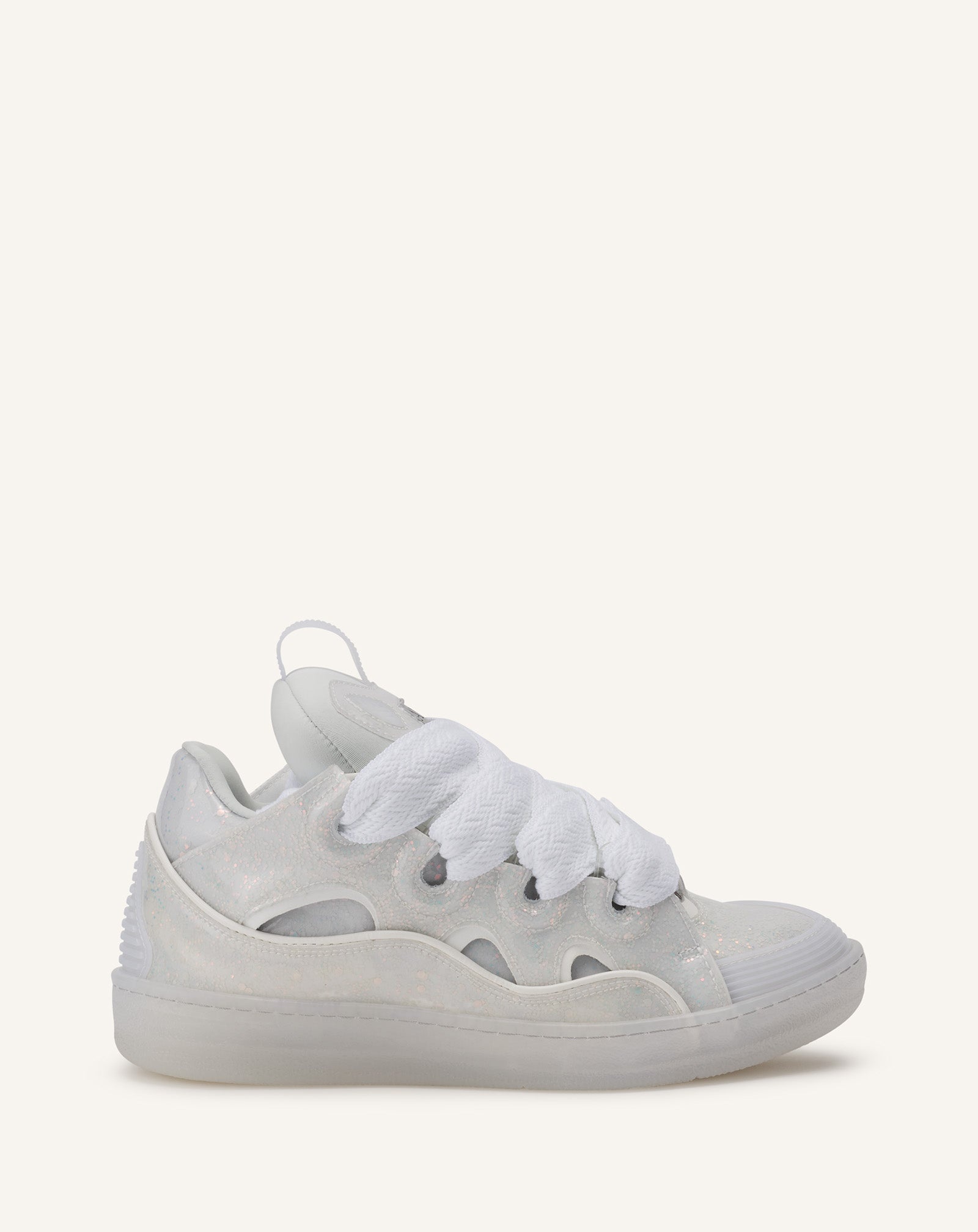 The Curb is a 90s-inspired sneaker with a bold design and exaggerated volumes. Made from glitter-effect leather with a delicate sheen and a translucent sole, this elaborately-constructed model offers ultimate comfort thanks to its round shape, padded tongue and transparent eyelets. Details - Toe type : almond toe - Closure : double laces - Other : sequin-effect leather uppers with openwork detailing - Double waxed and herringbone-woven laces - Quilted tongue with Lanvin label and embossed La Mere et l'Enfant logo - Translucent rubber sole for flexibility and grip - Made in Portugal Size & fit - This style fits true to size, you may take your usual size. - The size displayed corresponds to a French size Composition - Outer main material : 100% pvc SKU: FU-SKDK12-MEDU-P25000044