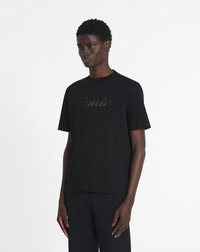 The handwritten interpretation of the Lanvin logo lends a chic, delicate touch to this t-shirt. A must-have for comfortable outfits, it adds elegance to a casual style. Details - Logo cotton denim t-shirt - Straight fit - Round neck - Embroidered Lanvin logo - Made in Portugal Size & fit - This style fits true to size, take your normal size - For more information, please see our size guide. Composition - Main fabric : 100% cotton knitted,100% cotton SKU: RM-TS0115-J171-P25102XL