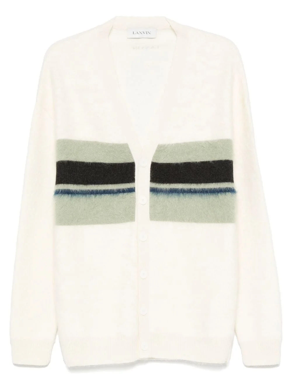 stripe-detail cardigan Highlights - Ecru - Front button fastening - V-neck - Ribbed cuffs and hem - Brushed finish Made in Italy Composition Polyester 100%, Virgin Wool 47%, Mohair 30%, Polyamide 23% Washing instructions Hand Wash