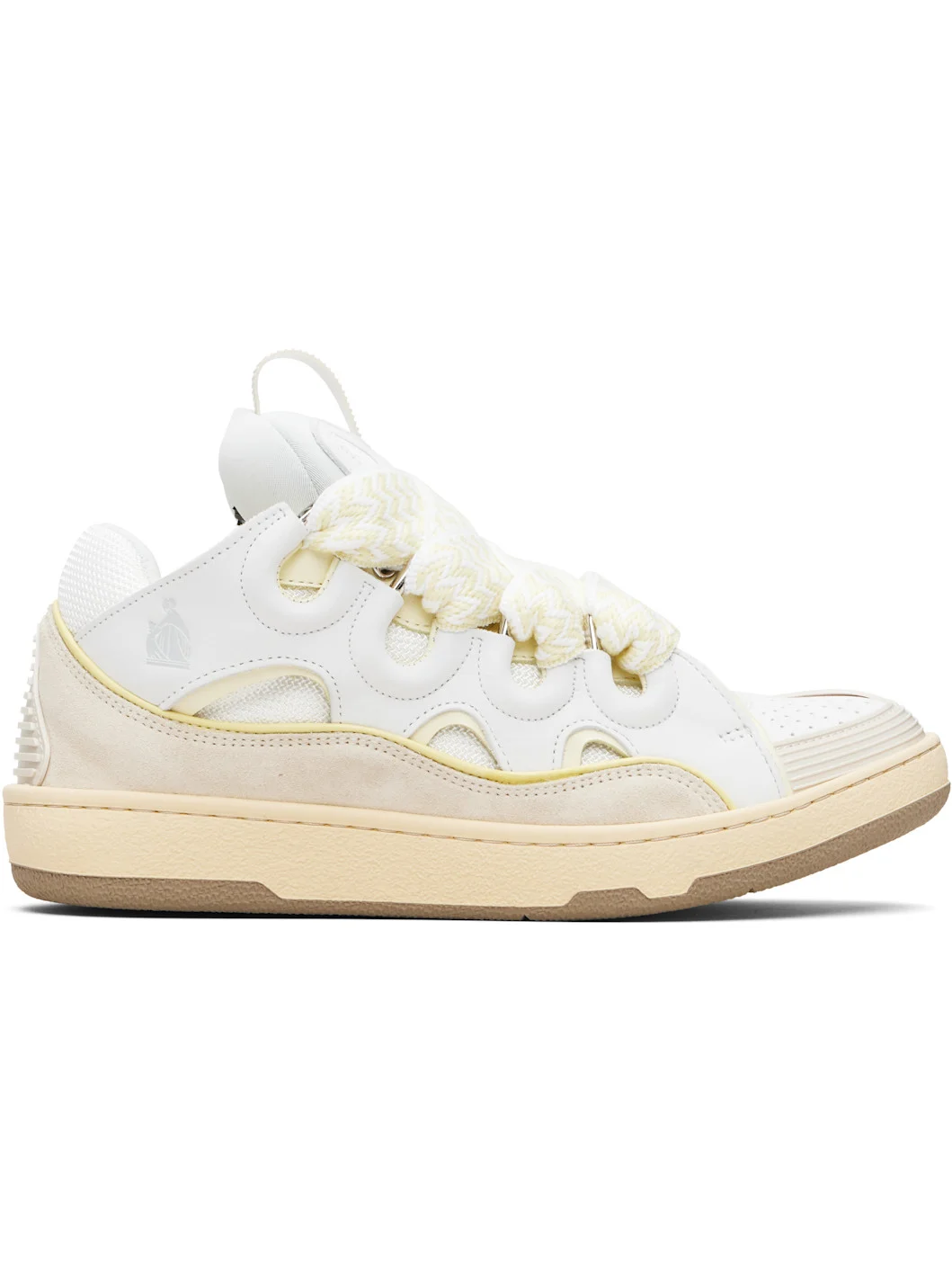 Low-top calfskin suede, nappa calfskin, and mesh sneakers. · Piping, cutouts, and rubberized trim throughout · Perforations at toe · Logo embossed at toe and outer side · Lace-up closure · Logo plaque and pull-loop at tongue · Padded tongue and collar · Jersey lining · Treaded rubber sole Supplier color: White/Beige Upper: calfskin, textile. Sole: rubber. Made in Portugal 252254M237075