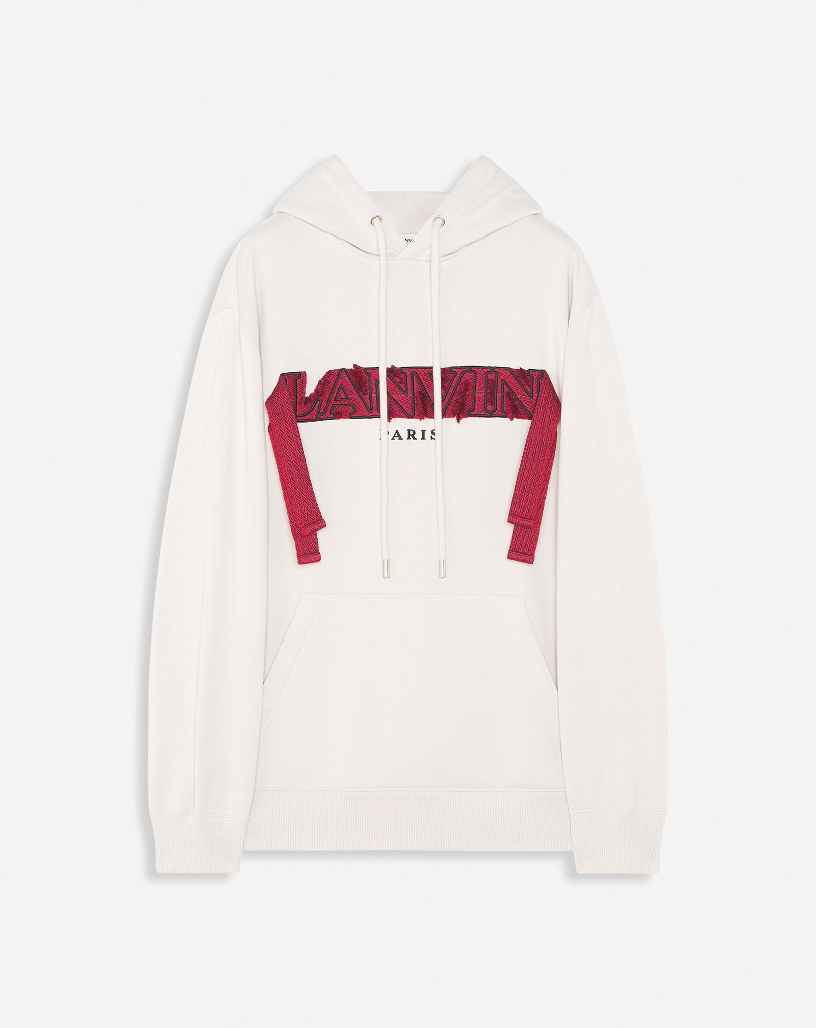 Details - Cotton fleece hoodie - Embroidered "Curb" Lanvin logo with long laces - Oversized fit - Color: mastic - Made in Italy Size and fit - The model is 189 cm / 6'2" tall - He wears a size M Composition - Main material: 100% cotton - Embroidery: 100% polyester Cleaning and care - Turn inside out before cleaning - Do not iron the embroidery SKU: RM-HO0009-J199-A23042XL