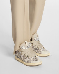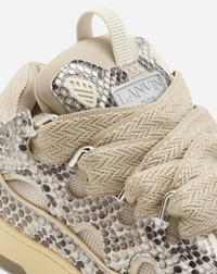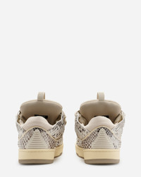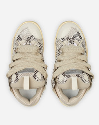 The Curb is a sneaker inspired by the 90s, with a confident design and exaggerated dimensions. Made in nappa calfskin, suede and mesh, this elaborately constructed shoe stands out for its extraordinary comfort thanks to the rounded shape, padded tongue, and curved metallic eyelets. Details - Python print leather Curb sneakers - Colors: Beige - Quilted tongue with Lanvin label and embossed Mother and Child logo - Double waxed and woven herringbone laces - Made in Portugal Composition - Main material: 100% calfskin - Material 2: 100% calfskin - Material 3: 100% polyester weave - Lining: 82% polyester weave, 18% Elastane - Sole: Rubber Cleaning and care - Clean gently with a soft cloth or bristled brush without products. - Store in a dry, dark place in its original packaging. SKU: FM-SKRK11-PTCA-A220539
