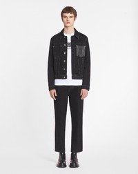 The denim of these pants has been lightly faded to bring a vintage effect to this garment. Featuring a leather pocket, this piece also takes inspiration from Jeanne Lanvin's signature Contrast concept. Details - Straight leather patch pants in denim - Fastening with metal buttons - Patch pockets on the back - Made in Italy Size & fit - This style fits true to size, take your normal size - For more information, please see our size guide. Composition - Main fabric : 100% cotton knitted SKU: RM-TR0119-D085-H241028