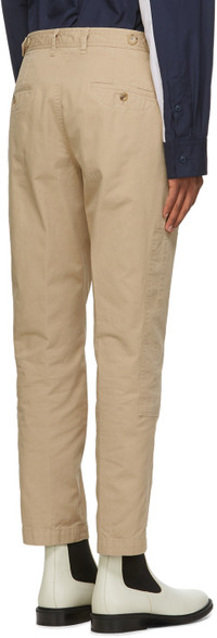 Tapered cotton twill chino trousers in tan. Mid-rise. Four-pocket styling. Belt loops and adjustable buttoned tabs at waistband. Paneled detailing at legs. Unlined. Zip-fly. Tortoiseshell hardware. Supplier color: Sand