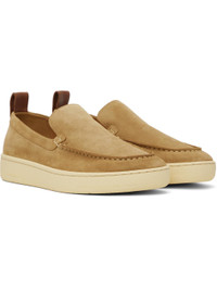 Low-top calfskin suede slip-on sneakers in tan. · Moc toe · Logo-embossed pull-loop at heel collar · Calfskin suede and buffed calfskin lining · Treaded rubber sole Supplier color: Dark beige Upper: calfskin. Sole: rubber. Made in Portugal 251254M231002