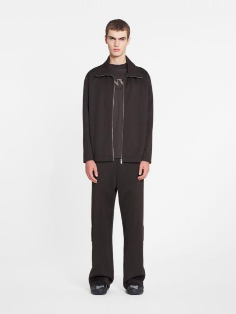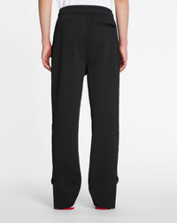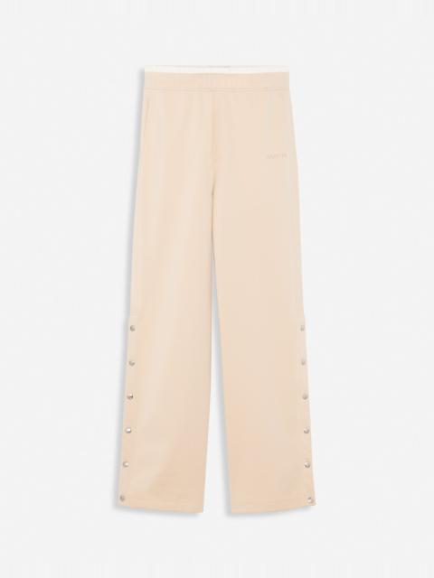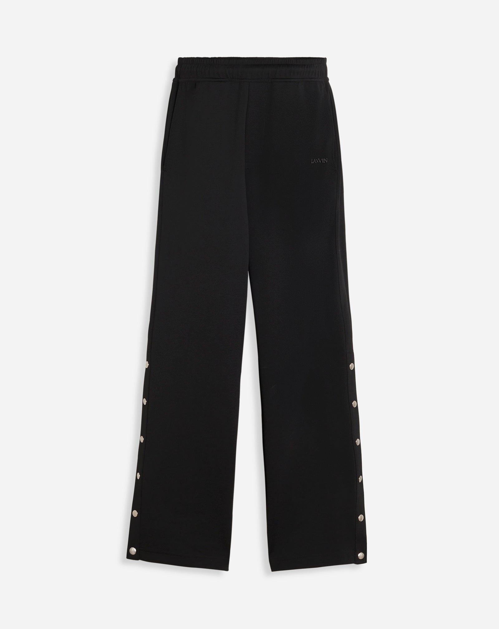 Details - Tracksuit joggers - Color: black - Tracksuit joggers in a shiny double face jersey featuring Lanvin logo embroidery detailing on the front - Snap buttons on the sides with Curb details on the button placket. - Made in italy Composition - Main material: 62% polyester, 28% cotton, 10% polyamide - Details: 100% cotton SKU: RM-TR0017-5583-P23102XL