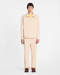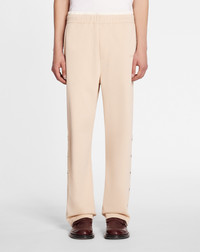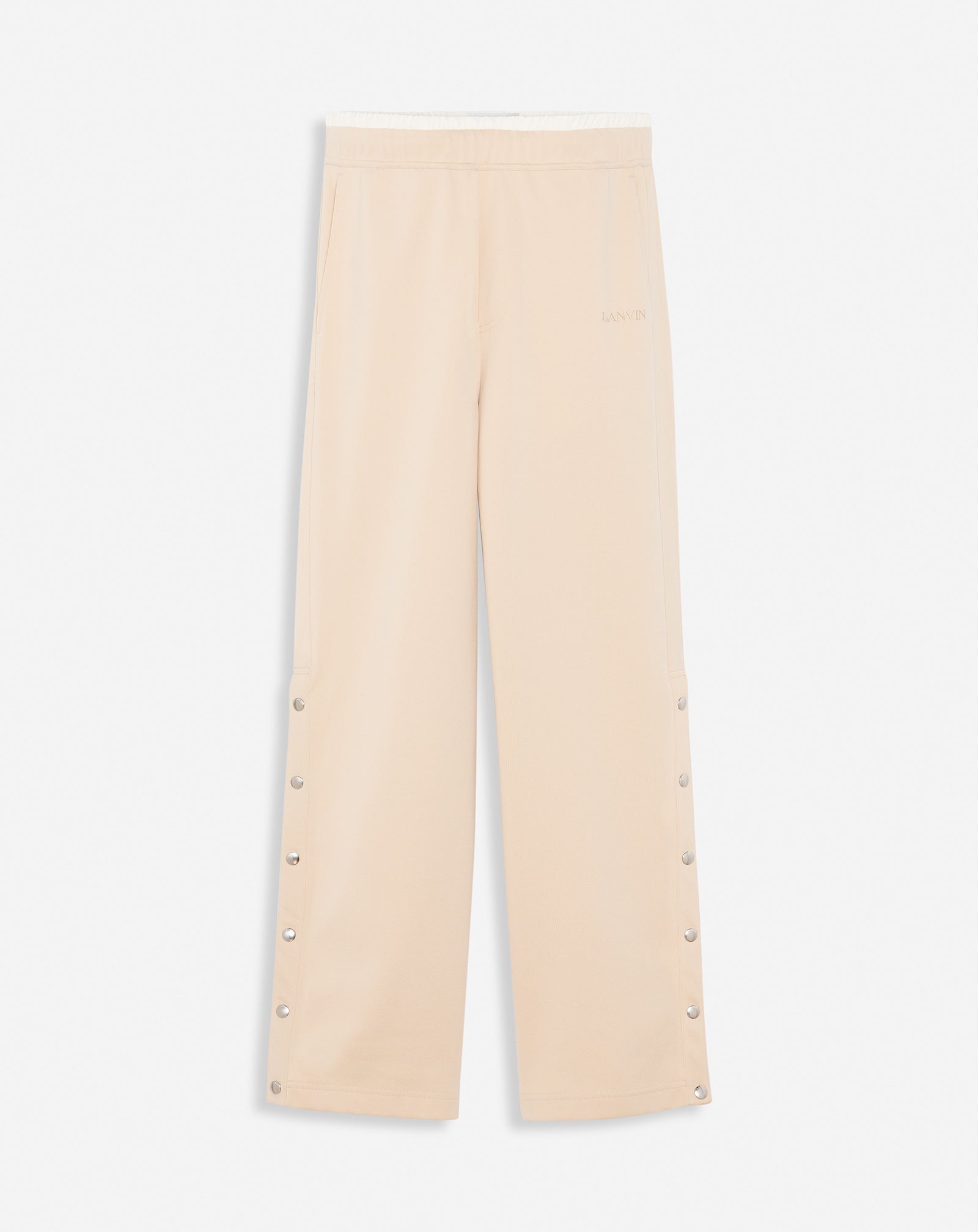 Details - Tracksuit pants in double-faced jersey with embroidered Lanvin logo detail - Curb detail and press studs at the bottom of the leg - Pair with the matching zip-up tracksuit top - Relaxed fit - Color: sand - Made in Italy Size and fit - The model is 189 cm / 6'2" tall - He wears a size M Composition - Main material: 62% polyester - Material 2: 28% cotton - Material 3: 10% polyamide Cleaning and care - Turn inside out before cleaning - Do not iron the embroidery SKU: RM-TR0017-5583-A23081L