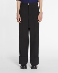 These elegant, modern pants are a perfect addition to the Lanvin man's wardrobe. They feature a belt at the waist for a chic outfit, right down to the details. Details - Wide-leg cuffed pants in wool - Metal zipper with a hook and loop fastening - Side and back pockets - Made in Italy Size & fit - This is a relaxed fit, size down if you are between two sizes - For more information, please see our size guide. Composition - Main fabric : 100% wool woven SKU: RM-TR0046-6016-H241048