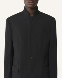 The straight, minimalist lines of this jacket create an elegant, timeless silhouette, enhanced by the stand-up collar and satin details, which are also found on the matching pants. Its Sartorial construction, with an inner interfacing sewn onto the outside, ensures a timeless, impeccable, and fluid drape. Thanks to its virgin wool, this piece combines thermoregulation, crease resistance, and a polished look. Details - Wool jacket with stand-up collar - Straight fit - Built-in shoulder pads - Satin details on the pockets, buttons, and facings - Slit cuffs with a one-button fastening - Fastening with a covered button - Two welt pockets with flaps - Made in Italy Size & fit - This style fits true to size, take your normal size - For more information, please see our size guide. Composition - Main fabric : 100% wool woven - Lining : 100% cupro woven SKU: RM-JA0113-5857-P261046