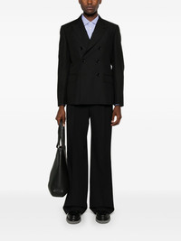 double-breasted blazer Highlights - Black - Virgin wool blend - Peak lapels - Brooch detail to the lapel - Shoulder pads - Long sleeves with buttoned cuffs - Chest patch pocket - Dart detailing - Two front flap pockets - Straight hem - Multiple internal slip pockets - Full lining - Double-breasted button fastening Made in Italy Composition Outer: Virgin Wool 87%, Mohair 13% Lining: Viscose 52%, Cupro 48% SIZE & FIT Model measurements Height 6 ft 2 in(1.88 m) Bust/Chest 36.61 in(93 cm) Hips 35.82 in(91 cm) Waist 27.95 in(71 cm) FittingInformation Designed for a slim fit, offering a comfortable fit that sits just away from the body The internal shoulder pads offer a structured shape Made from a midweight non-stretch fabric This piece fits true to size – take your usual size