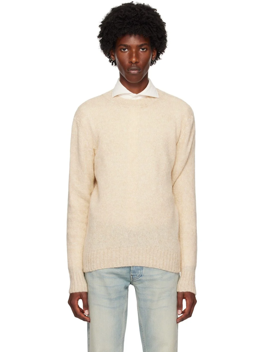 7-gauge knit alpaca-blend sweater. · Rib knit crewneck, hem, and cuffs · Dropped shoulders Supplier color: Beige 49% alpaca, 30% nylon, 21% wool. Made in Italy 242125M201000