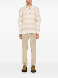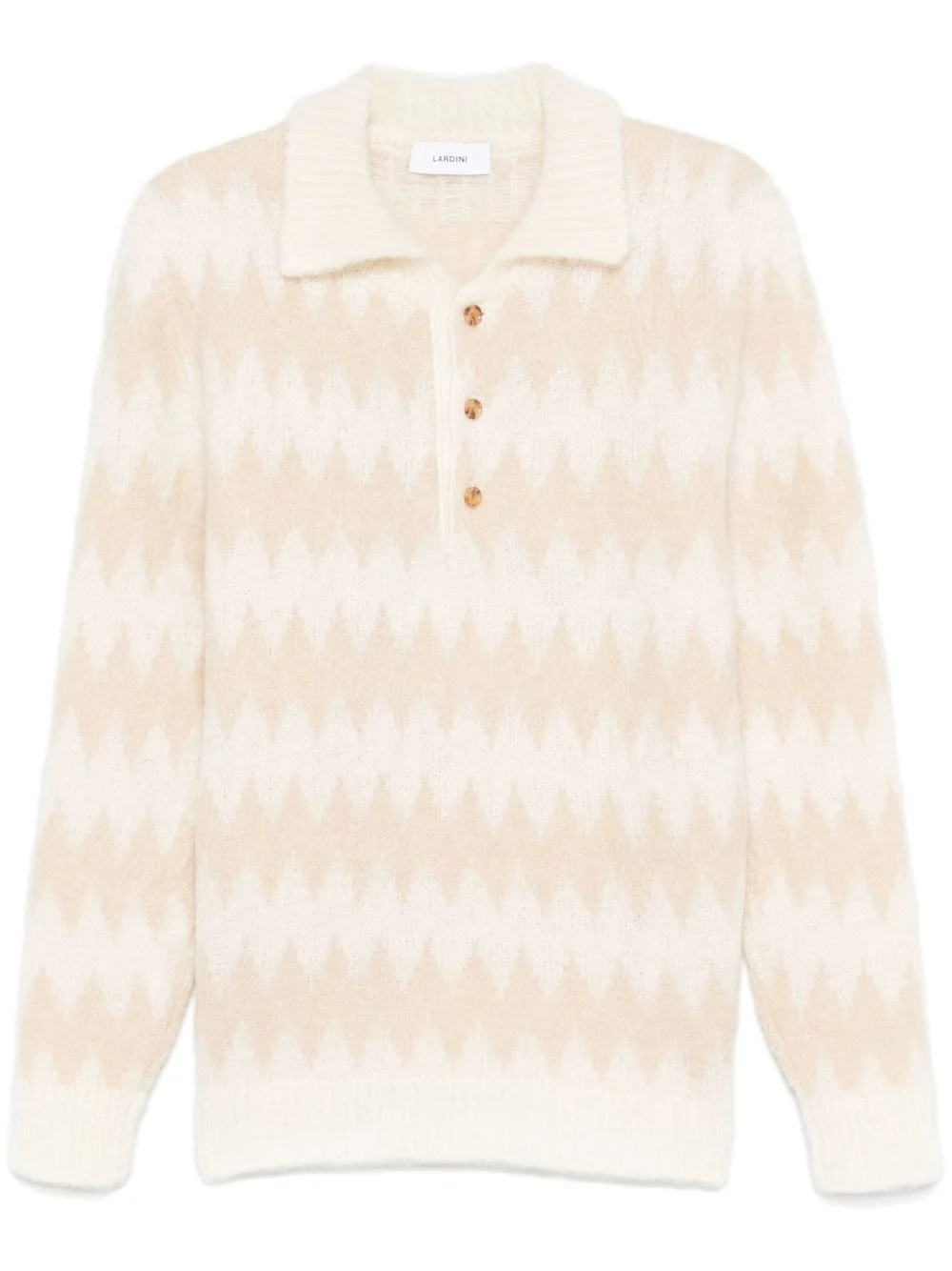 zigzag polo sweater Highlights - White/beige - Kid mohair-blend - Knitted construction - Brushed effect - Zigzag patterned jacquard - Front button placket - Polo collar - Long sleeves - Ribbed cuffs and hem - Straight hem Made in Italy Composition Kid Mohair 81%, Polyester 17%, Elastane 2% SIZE & FIT Model measurements Height 6 ft 1 in(1.85 m) Bust/Chest 35.82 in(91 cm) Hips 37.79 in(96 cm) Waist 29.13 in(74 cm) FittingInformation Designed for a regular fit, this polo shirt offers a comfortable loose fit throughout the body Made with a midweight knit, this piece offers some stretch