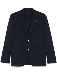brooch-detail blazer Highlights - Oxford blue - Front button fastening - Buttoned cuffs - Chest welt pocket - Two front patch pockets Made in Italy Composition Outer: Wool 67%, Cotton 17%, Polyester 15%, Spandex/Elastane 1% Lining: Viscose 52%, Cupro 48% SIZE & FIT Model measurements Height 6 ft 2 in(1.87 m) Bust/Chest 38.18 in(97 cm) Hips 36.61 in(93 cm) Waist 29.13 in(74 cm) FittingInformation Designed for a slim fit, offering a comfortable fit that sits just away from the body The vented hem offers movement at the rear Made from a midweight fabric