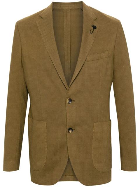 brooch-detail single-breasted blazer Highlights - Midnight blue - Cotton-silk blend - Interlock twill weave - Dart detailing - Brooch detail - Notched lapels - Front button fastening - Long sleeves with buttoned cuffs - Chest welt pocket - Two front patch pockets - Internal jetted pockets - English rear vents - Curved hem Made in Italy Composition Outer: Cotton 90%, Silk 10% Lining: Polyester 100% SIZE & FIT Model measurements Height 6 ft 2 in(1.88 m) Bust/Chest 35.43 in(90 cm) Hips 35.03 in(89 cm) Waist 27.95 in(71 cm) FittingInformation Designed for a slim fit, offering a comfortable fit that sits just away from the body The vented hem offers movement at the rear Made from a midweight non-stretch fabric This piece fits true to size – take your usual size
