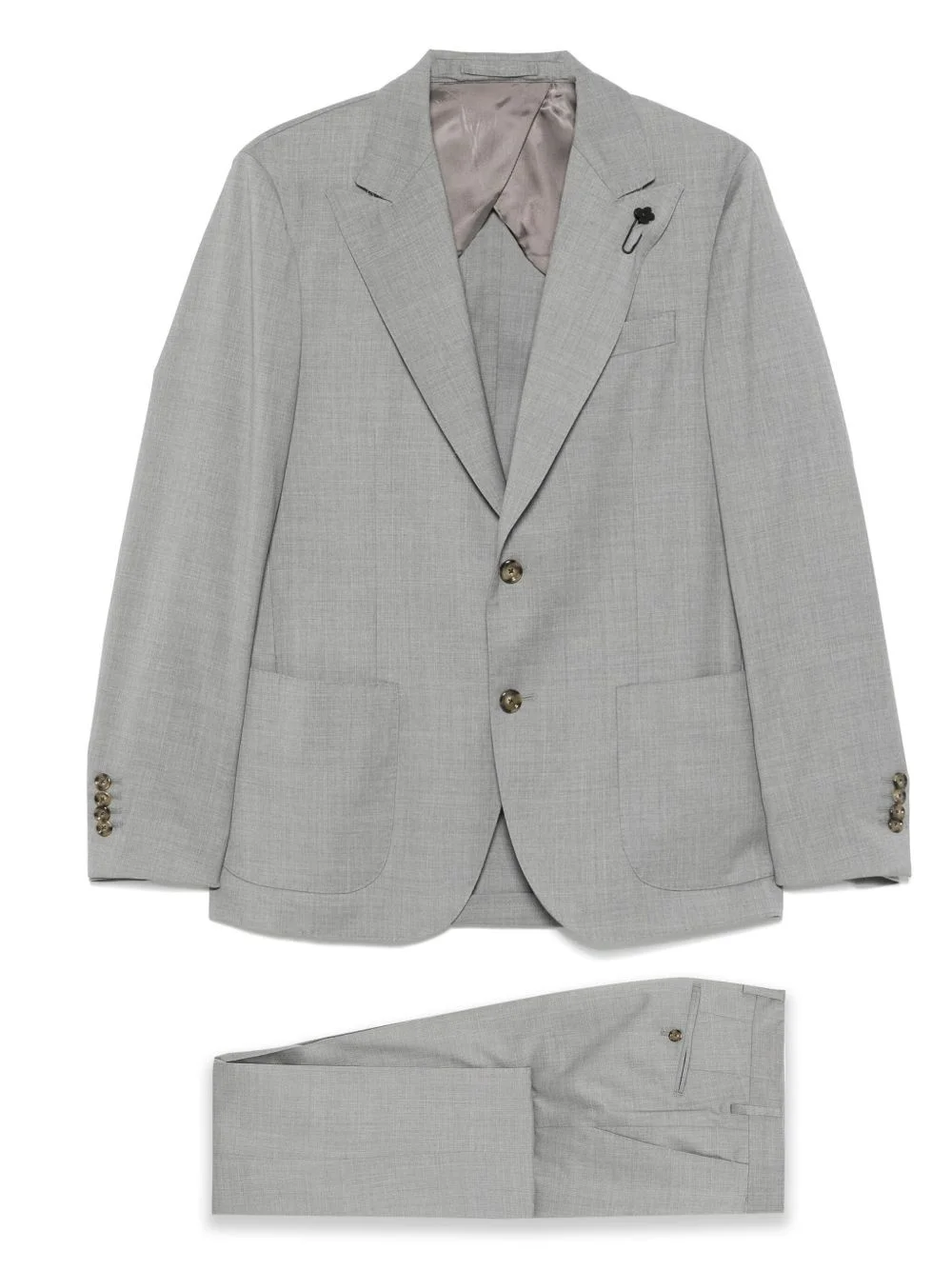 brooch-detail suit Highlights - Grey - Front button fastening - Button fly fastening - English rear vents - Two side slash pockets Made in Italy Composition Outer: Virgin Wool 100% Lining: Viscose 52%, Cupro 48% SIZE & FIT Model measurements Height 6 ft 2 in(1.87 m) Bust/Chest 37 in(94 cm) Hips 33.85 in(86 cm) Waist 27.95 in(71 cm) FittingInformation Tailored for a slim fit, offering a comfortable fit that sits just away from the body The unfinished hems allow for the length to be altered Made from a midweight non-stretch fabric