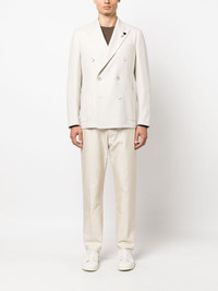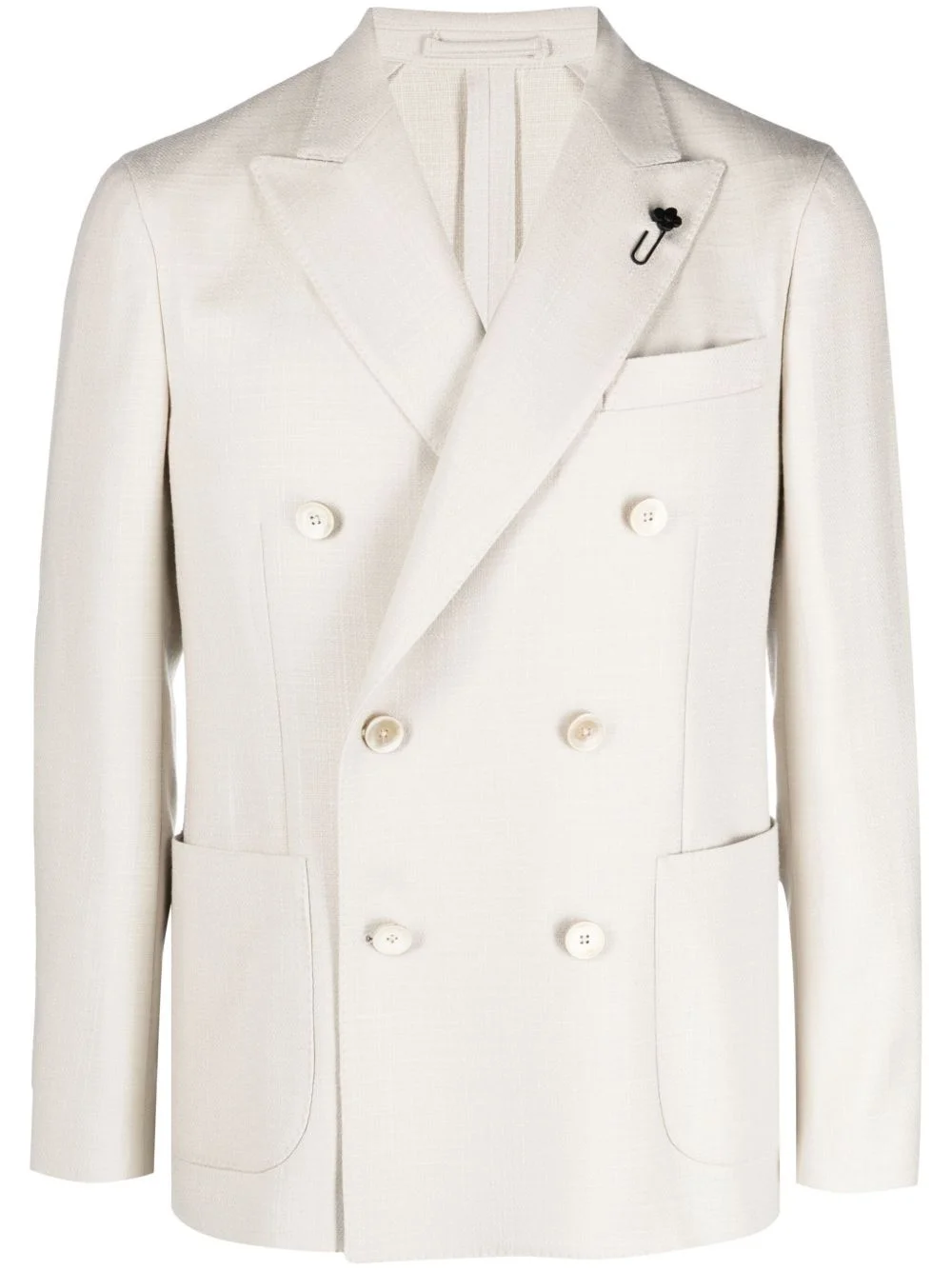 peak-lapel double-breasted blazer Highlights - Beige - Wool-silk blend - Brooch detail - Peak lapels - Double-breasted button fastening - Long sleeves - Buttoned cuffs - Jetted chest pocket - Straight hem Made in Italy Composition Outer: Wool 66%, Silk 32% Lining: Viscose 52%, Cupro 48% SIZE & FIT Model measurements Height 6 ft 1 in(1.86 m) Bust/Chest 37.4 in(95 cm) Hips 36.22 in(92 cm) Waist 29.52 in(75 cm) FittingInformation Designed for a regular fit, allowing for a comfortably loose fit throughout the body The vented hem offers movement at the rear Made from a midweight non-stretch fabric This piece fits true to size – take your usual size