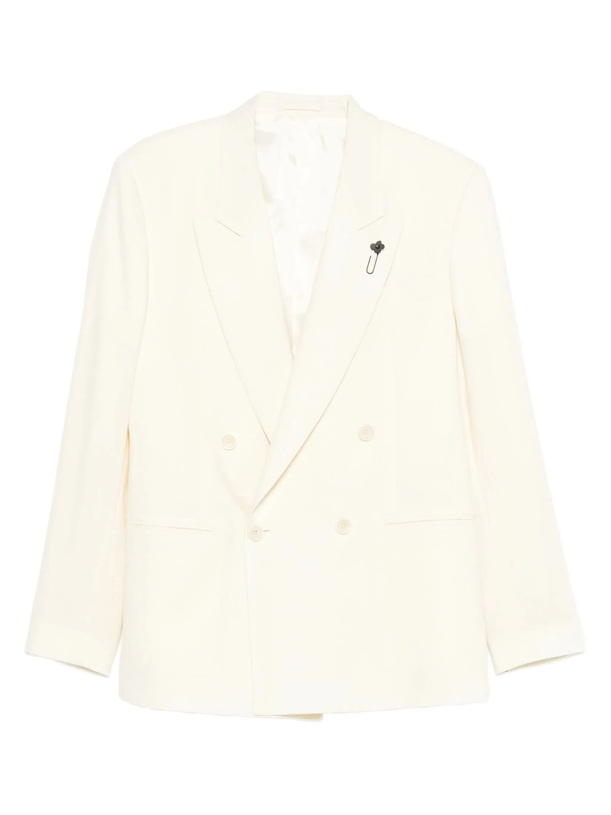 off-white double-breasted closure peak lapels button fastening welt pockets brooch detail - Color: NEUTRALS - Made in: Italy - Designer Style ID: AA6906E AAIF65519 150 Composition and care Lining Composition Cupro: 48.0%, Lining Composition Viscose: 52.0%, Outer Composition Virgin Wool: 100.0%