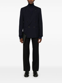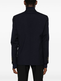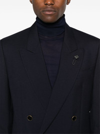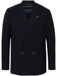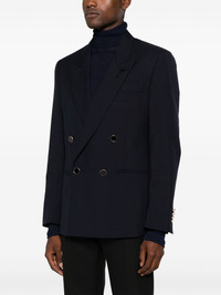 double-breasted blazer Highlights - Navy blue - Virgin wool - Peak lapels - Brooch detail to the lapel - Shoulder pads - Long sleeves with buttoned cuffs - Chest patch pocket - Dart detailing - Two front jetted pockets - Straight hem - Multiple internal slip pockets - Full lining Made in Italy Composition Lining: Viscose 52%, Cupro 48% Outer: Virgin Wool 100% SIZE & FIT Model measurements Height 6 ft 2 in(1.88 m) Bust/Chest 36.61 in(93 cm) Hips 35.82 in(91 cm) Waist 27.95 in(71 cm) FittingInformation Designed for a slim fit, offering a comfortable fit that sits just away from the body The internal shoulder pads offer a structured shape Made from a midweight non-stretch fabric This piece fits true to size – take your usual size Washing instructions Dry Clean Only