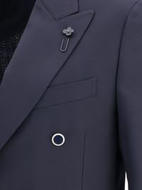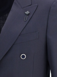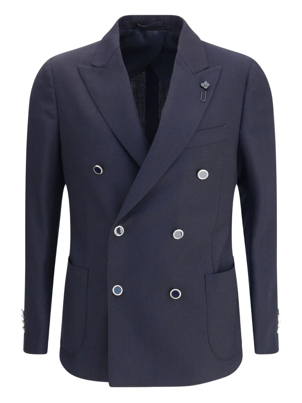 double-breasted herringbone blazer Highlights - Navy blue - Herringbone weave - Double-breasted closure - Patch pockets - Logo pin Made in Italy Composition Wool 100% Washing instructions Read Manufacturer Guidelines
