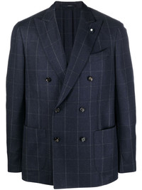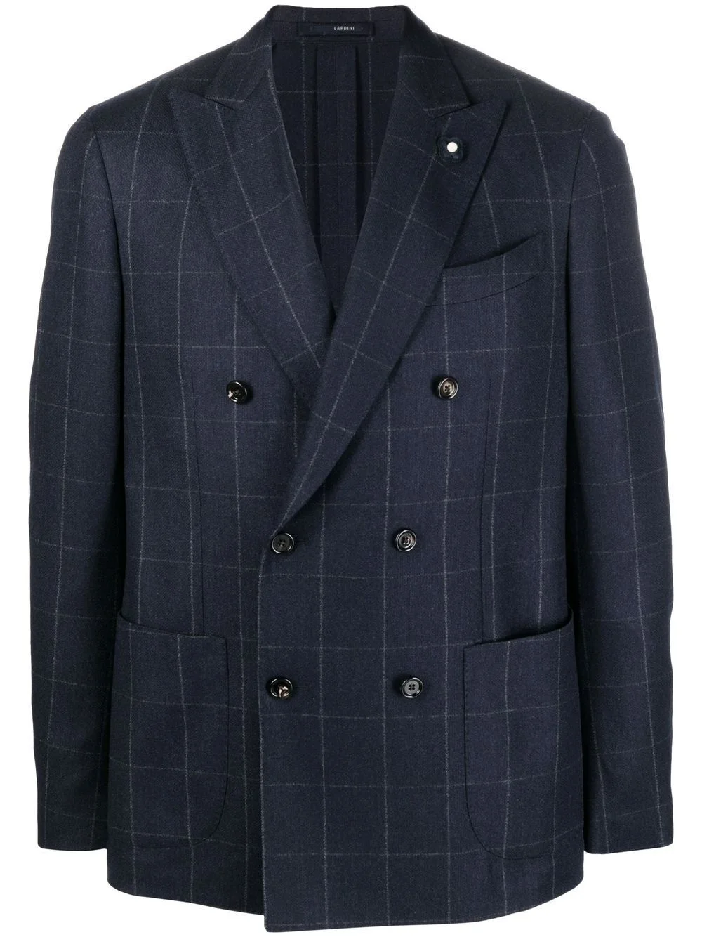double-breasted checked blazer midnight blue wool-cashmere blend check pattern double-breasted button fastening classic lapels chest welt pocket two front patch pockets Made in Italy Composition Outer: Wool 98%, Cashmere 2% Lining: Polyester 100% SIZE & FIT Model measurements Height 6 ft 0 in(1.84 m) Bust/Chest 35.82 in(91 cm) Hips 37 in(94 cm) Waist 28.34 in(72 cm) FittingInformation This piece fits true to size. We recommend you get your regular size Cut for a slim fit Made with a mid-weight non-stretch fabric