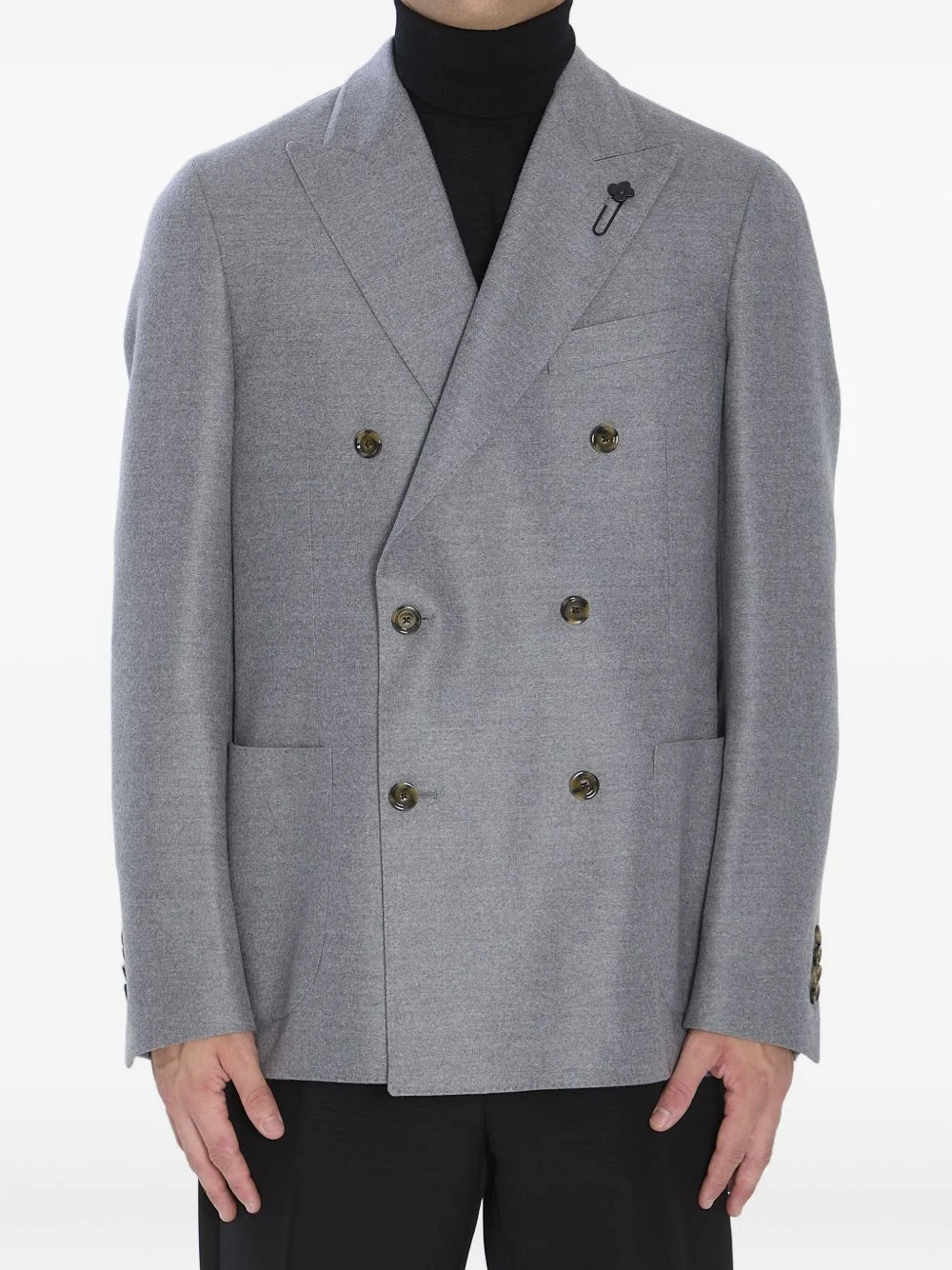 double-breasted jacket Highlights - Grey - Peaked lapels - Six button closure - Two patch pockets - Buttoned cuffs - Back vents - Collar pin Made in Italy Composition Outer: Virgin Wool 100% Lining: Viscose 52%, Cupro 48% Washing instructions Read Manufacturer Guidelines