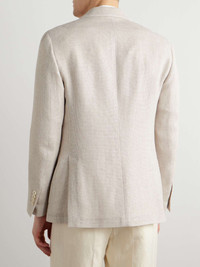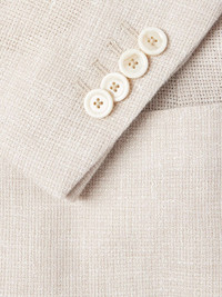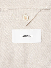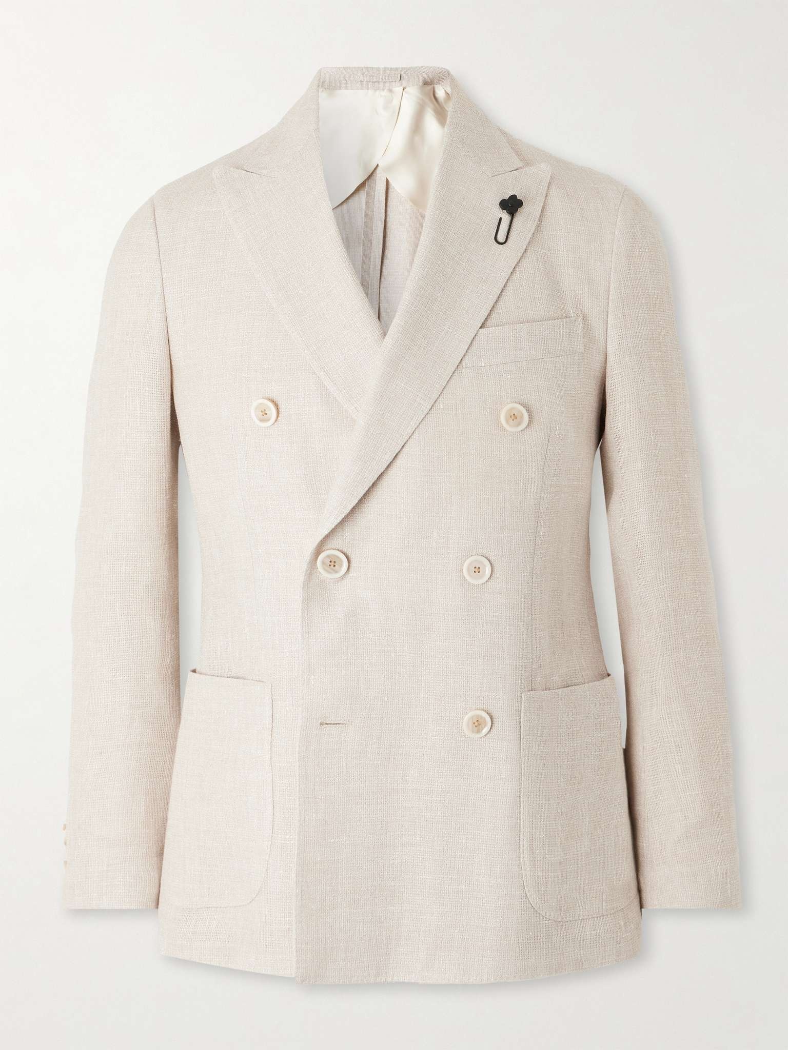 Lardini’s double-breasted blazer is tailored with wide peak lapels that create the look of broad shoulders. It's been made in Italy from airy, lightweight linen and wool-blend crepe and features the label's iconic flower pin. Size & Fit - Those with broad shoulders may wish to take the next size up - Designed for a regular fit - Lightweight, non-stretchy fabric - Model is shown wearing an IT 50 - Model measures: chest 38"/ 96cm, height 6'2"/ 188cm Details & Care - Beige melange linen and wool-blend crepe - Peak lapels, non-functioning buttoned cuffs, chest welt pocket, two front patch pockets, double vent, internal pockets, butterfly lining - Double-breasted button fastenings - 75% linen, 25% wool; lining: 52% viscose, 48% cupro - Dry clean