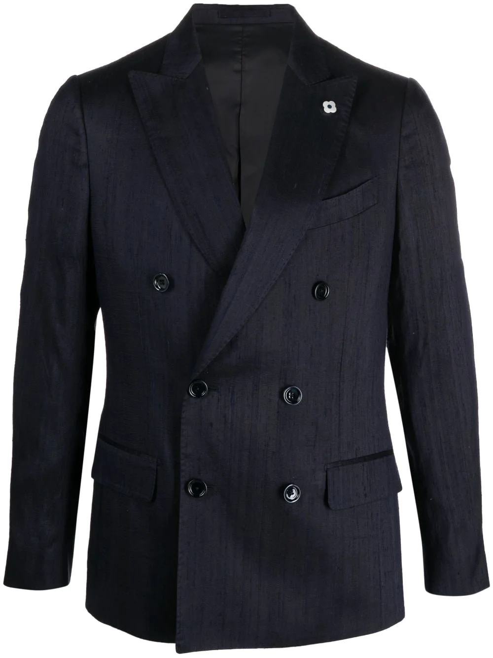 double-breasted silk blazer Highlights - Midnight blue - Silk - Shantung - Peak lapels - Double-breasted button fastening - Long sleeves - Buttoned cuffs - English rear vents - Two side flap pockets - Chest welt pocket Made in Italy Composition Silk 100%, Viscose 52%, Cupro 48% SIZE & FIT Model measurements Height 6 ft 0 in(1.84 m) Bust/Chest 35.82 in(91 cm) Hips 37 in(94 cm) Waist 28.34 in(72 cm) FittingInformation Designed for a slim fit, offering a comfortable fit that sits just away from the body The dart stitching adds structure and a closer fit in the torso of this piece Made from a midweight non-stretch fabric This piece fits true to size – take your usual size