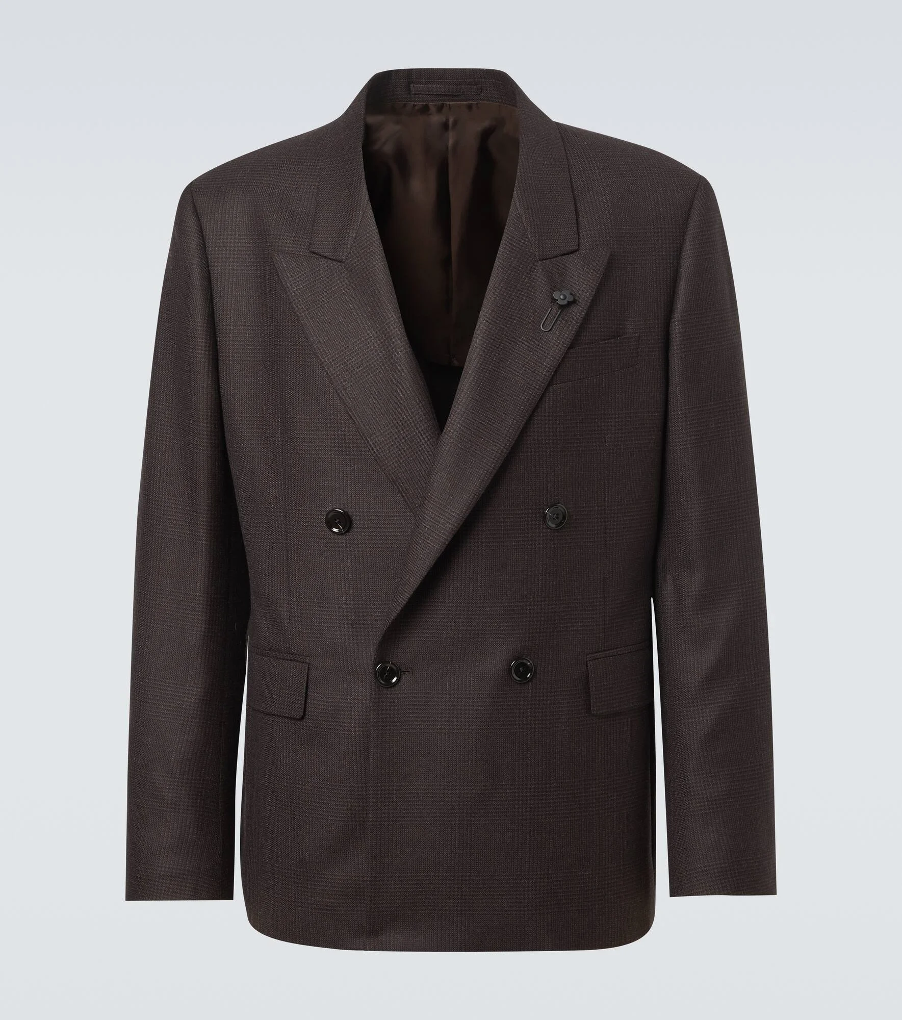 This sophisticated double-breasted blazer by Lardini is crafted in Italy from wool, offering a refined yet comfortable fit. This stylish design features a checked pattern, peak lapels, flap pockets without stitching, and structured shoulders. Product Details - Material: 100% virgin wool - Care instructions: dry clean - Made in Italy - Designer color name: Brown - Item color: brown - Lining: 52% viscose, 48% cupro - Blazer - Closure: double-breasted (four buttons) - Pockets: flap pockets - Peak lapel - Vent: double - Item number: P01066606 Size & Fit - True to size - Shoulder pad inserts - Regular fit - Non-stretchy fabric - Falls to the hip - Height of model is 188cm-74" and wears a size IT 50