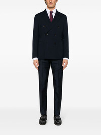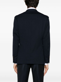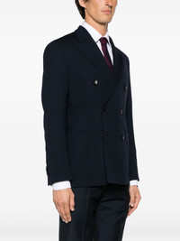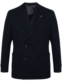 double-breasted wool blazer Highlights - Navy blue - Stretch-wool - Gabardine weave - Dart detailing - Brooch detail - Peak lapels - Shoulder pads - Double-breasted button fastening - Long sleeves - Buttoned cuffs - Two front patch pockets - Chest welt pocket - Internal slip pocket - Internal logo patch - Straight hem - English rear vents - Full lining Made in Italy Composition Outer: Wool 98%, Spandex/Elastane 2% Lining: Viscose 52%, Cupro 48% SIZE & FIT Model measurements Height 6 ft 2 in(1.89 m) Bust/Chest 37.79 in(96 cm) Hips 37 in(94 cm) Waist 29.92 in(76 cm) FittingInformation Designed for a slim fit, offering a comfortable fit that sits just away from the body The vented hem offers movement at the rear Made from a midweight fabric This piece fits true to size – take your usual size