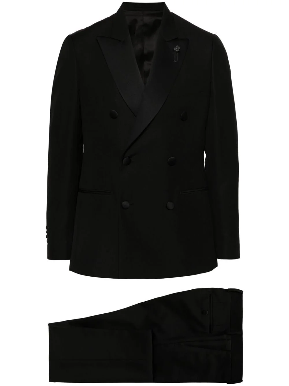 double-breasted wool-blend suit Highlights - Black - Wool blend - Jacket: - Safety pin detail - Peak lapels - Double-breasted button fastening - Shoulder pads - Long sleeves - Buttoned cuffs - Chest welt pocket - Two side welt pockets - American rear vent - Full lining - Trousers: - Mid-rise - Belt loops - Concealed front fastening - Two side slash pockets - Two rear welt pockets - Straight leg Made in Italy Composition Outer: Wool 86%, Mohair 11%, Polyamide 2%, Spandex/Elastane 1% Lining: Viscose 52%, Cupro 48% SIZE & FIT Model measurements Height 6 ft 2 in(1.89 m) Bust/Chest 36.22 in(92 cm) Hips 35.82 in(91 cm) Waist 28.54 in(72.5 cm) FittingInformation Tailored for a slim fit, offering a comfortable fit that sits just away from the body The unfinished hems allow for the length to be altered Made from a midweight non-stretch fabric This piece fits true to size – take your usual size Washing instructions Dry Clean Only