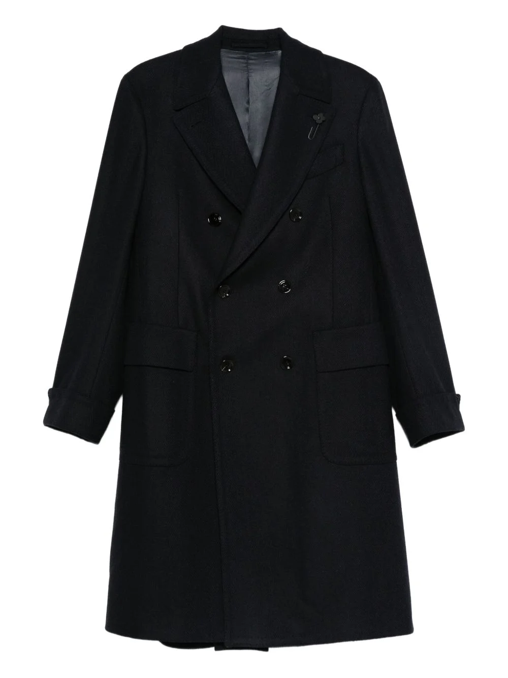 double-breasted wool coat Highlights - Black - Herringbone weave - Double-breasted fastening - Patch pockets - Peak lapel Made in Italy Composition Wool 95%, Cashmere 5% SIZE & FIT Model measurements Height 6 ft 0 in(1.84 m) Bust/Chest 35.82 in(91 cm) Hips 37 in(94 cm) Waist 28.34 in(72 cm) Washing instructions Read Manufacturer Guidelines