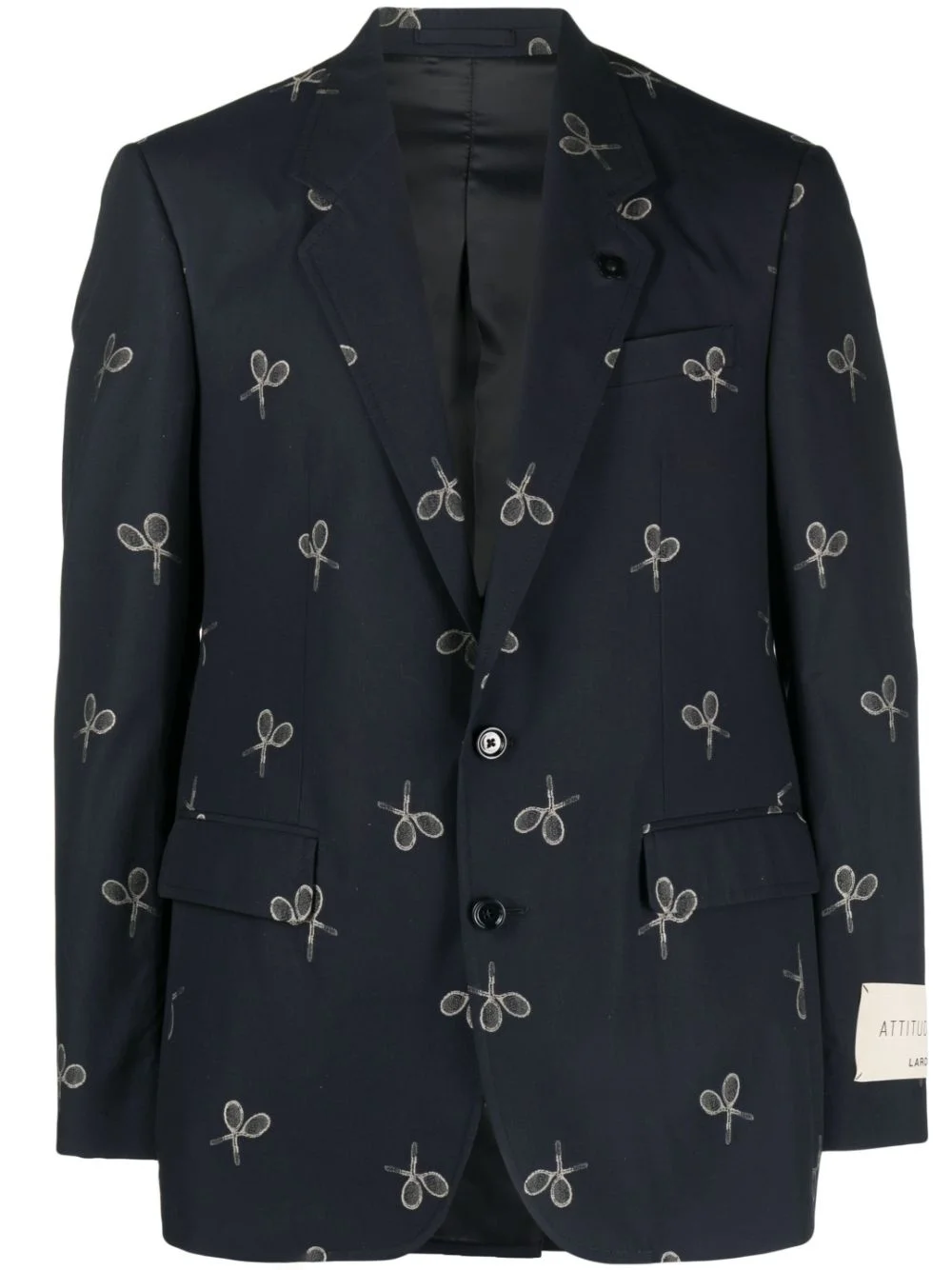 graphic-print single-breasted blazer Highlights - Navy blue - Cotton - All-over graphic print - Enamel detail - Notched lapels - Front button fastening - Two front flap pockets - Chest welt pocket - Long sleeves - Logo patch at the sleeve - Buttoned-cuff sleeves - Straight hem - American rear vent Made in Italy Composition Outer: Cotton 100% SIZE & FIT Model measurements Height 6 ft 2 in(1.87 m) Bust/Chest 38.18 in(97 cm) Hips 36.61 in(93 cm) Waist 29.13 in(74 cm) FittingInformation Designed for a slim fit, offering a comfortable fit that sits just away from the body The vented hem offers movement at the rear Made from a midweight non-stretch fabric This piece fits true to size – take your usual size