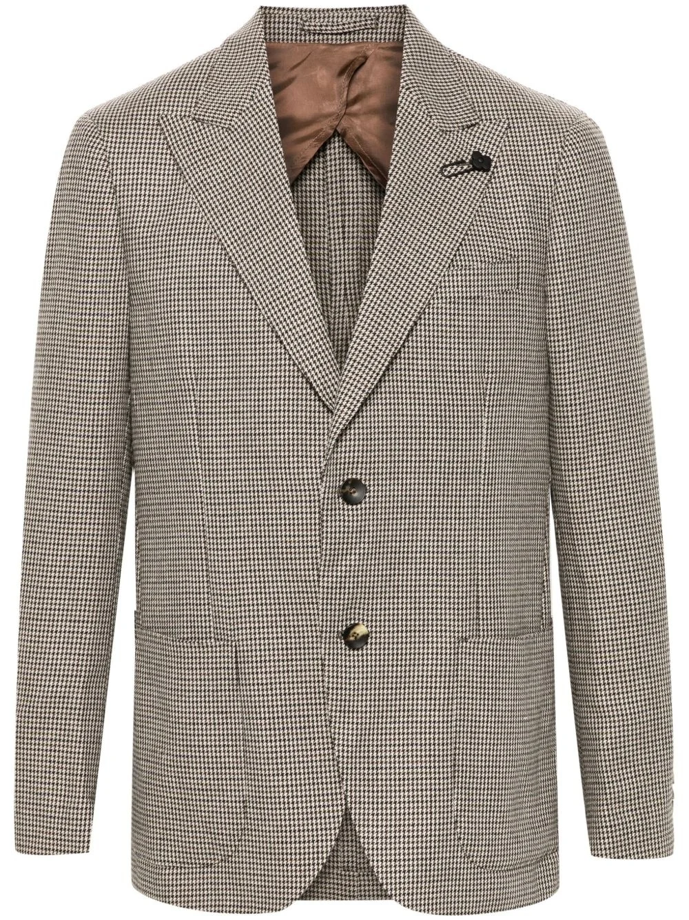 houndstooth blazer Highlights - Houndstooth pattern - Peak lapels - Long sleeves - Faux-buttoned cuffs - Chest welt pocket - Two side patch pockets - English rear vents - Straight hem - Front button fastening Made in Italy Composition Outer: Viscose 70%, Wool 30% Lining: Viscose 52%, Cupro 48% SIZE & FIT Model measurements Height 6 ft 1 in(1.85 m) Bust/Chest 38.58 in(98 cm) Hips 37 in(94 cm) Waist 30.31 in(77 cm) FittingInformation Designed for a slim fit, offering a comfortable fit that sits just away from the body The vented hem offers movement at the rear Made from a midweight non-stretch fabric This piece fits true to size – take your usual size