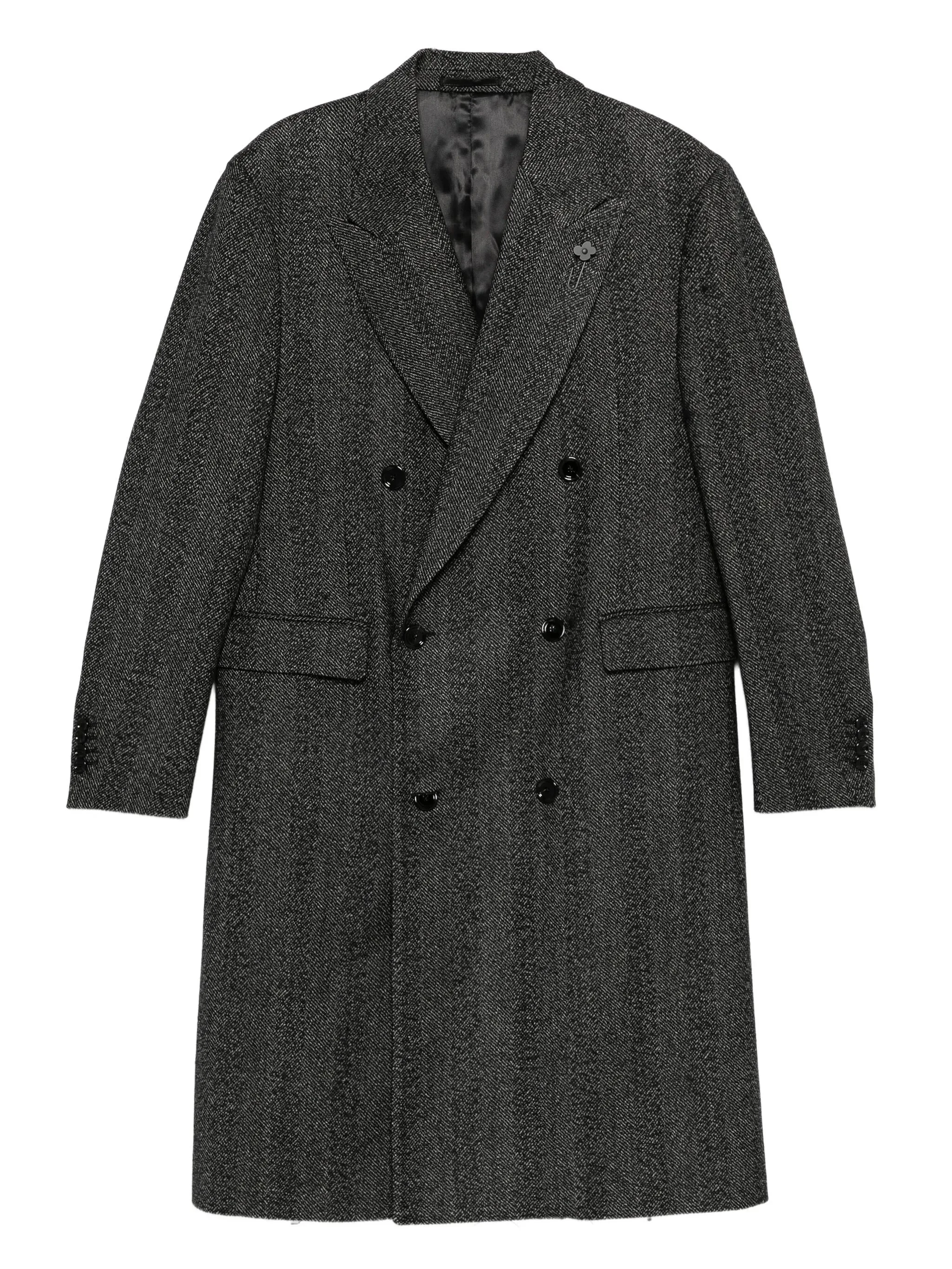 black herringbone weave double-breasted closure peak lapels flap pockets button fastening - Color: BLACK - Made in: Italy - Designer Style ID: AA40408E AAC65611 950 Composition and care Lining Composition Acetate: 65.0%, Lining Composition Viscose: 35.0%, Outer Composition Wool: 100.0%