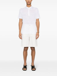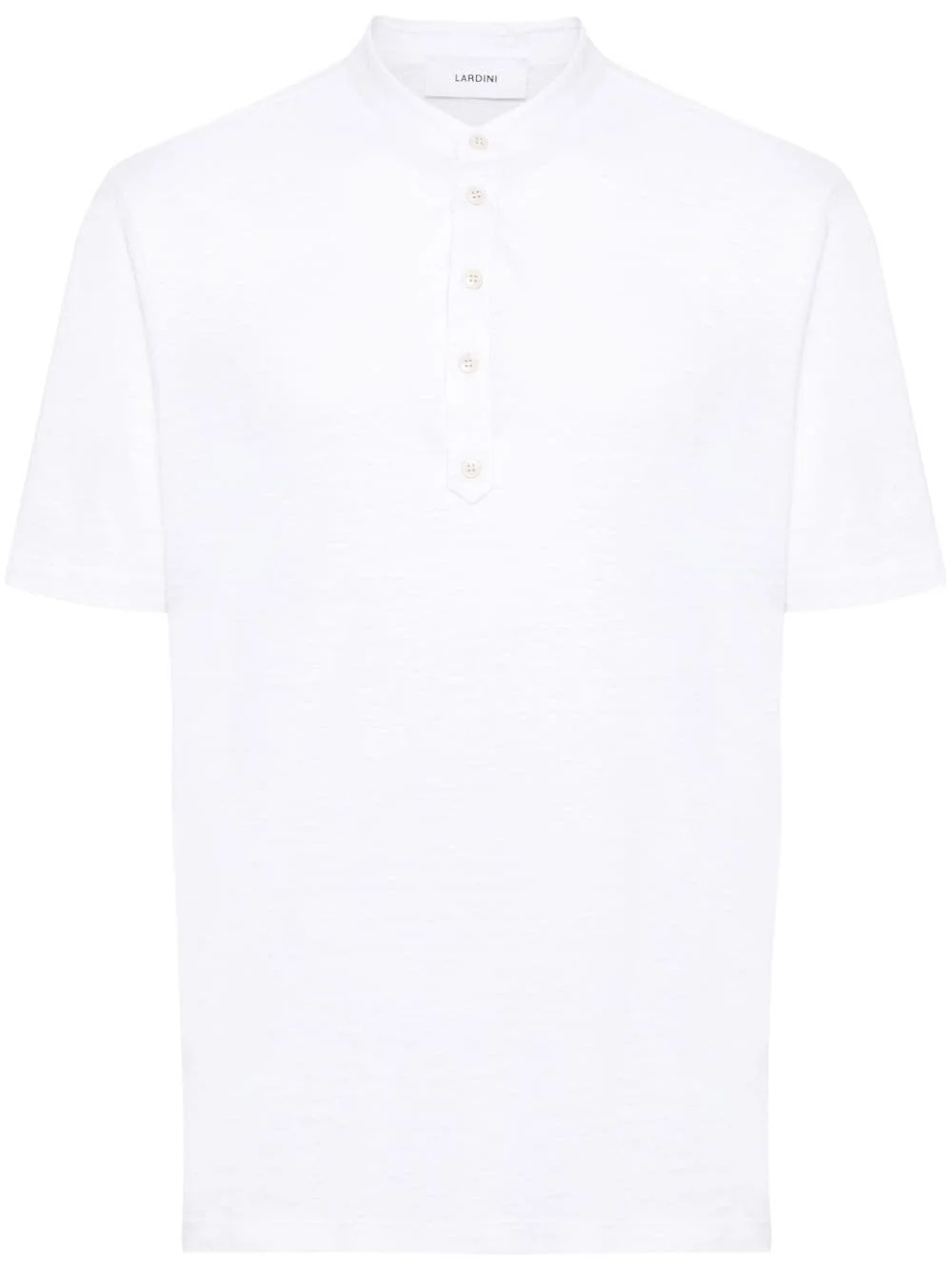 mock-neck linen T-shirt Highlights - White - Linen/flax - Slub texture - Mock neck - Short sleeves - Front button placket - Straight hem Made in Italy Composition Linen/Flax 100% SIZE & FIT Model measurements Height 6 ft 2 in(1.87 m) Bust/Chest 38.18 in(97 cm) Hips 36.61 in(93 cm) Waist 29.13 in(74 cm) FittingInformation Designed for a regular fit allowing for a comfortably loose fit throughout the body Made from a midweight non-stretch fabric, this piece offers minimal elasticity when worn This piece fits true to size – take your usual size