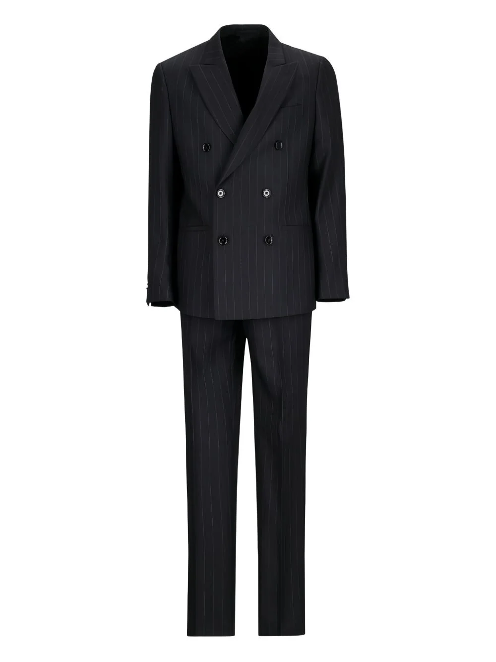 pinstripe double-breasted suit Highlights - Black - Pinstripe pattern - Double-breasted closure - Peak lapels - Long sleeves - Straight trousers Made in Italy Composition Fabric 100% Washing instructions Read Manufacturer Guidelines