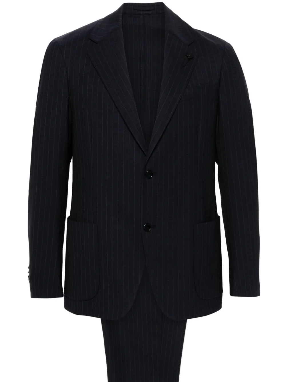 pinstriped suit Highlights - Midnight blue - Virgin wool blend - Pinstripe pattern - Dart detailing - Jacket: - Brooch detail - Notched lapels - Long sleeves with faux-buttoned cuffs - Chest welt pocket - Two front patch pockets - Front button fastening - English rear vents - Two internal patch pockets - Curved hem - Partial lining - Trousers: - Pleat detailing at the front - Two front welt pockets - Two rear welt pockets - Elasticated drawstring waistband - Concealed front button, hook and zip fastening - Low-rise - Tailored cut - Unlined Made in Italy Composition Virgin Wool 55%, Viscose 52%, Cupro 48%, Polyester 41%, Spandex/Elastane 4% SIZE & FIT Model measurements Height 6 ft 1 in(1.85 m) Bust/Chest 38.58 in(98 cm) Hips 37 in(94 cm) Waist 30.31 in(77 cm) FittingInformation Tailored for a slim fit, offering a comfortable fit that sits just away from the body The unfinished hems allow for the length to be altered Made from a midweight fabric This piece fits true to size – take your usual size Washing instructions Dry Clean Only