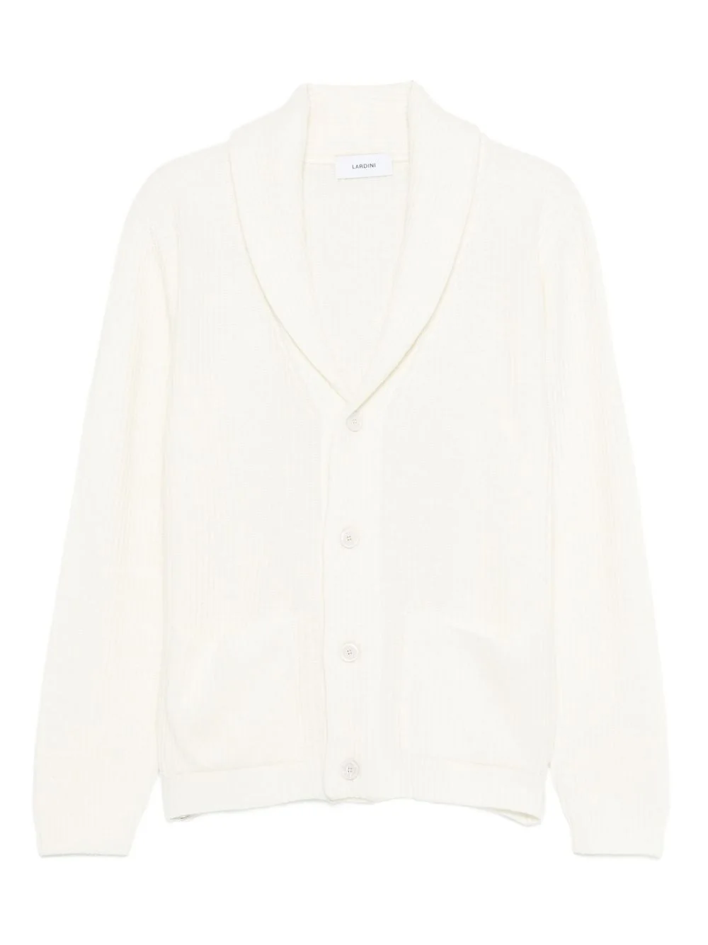 shawl-collar buttoned cardigan Highlights - White - Ribbed knit - Shawl collar - Front button fastening - Front patch pocket Made in Italy Composition Virgin Wool 90%, Cashmere 10% Washing instructions Read Manufacturer Guidelines