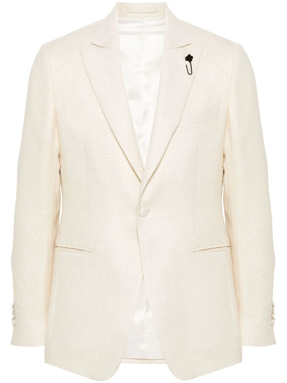 single-breasted blazer Highlights - Gold-tone - Wool blend - Lurex detailing - Notched lapels - Detachable applique logo - Long sleeves with buttoned cuffs - Chest welt pocket - Two side welt pockets - Multiple internal slip pockets - Full lining - Straight hem - Front button fastening Made in Italy Composition Outer: Wool 94%, Mylon 3%, Polyester 3% Lining: Viscose 52%, Cupro 48% SIZE & FIT Model measurements Height 6 ft 2 in(1.89 m) Bust/Chest 37.4 in(95 cm) Hips 35.03 in(89 cm) Waist 27.95 in(71 cm) FittingInformation Designed for a slim fit, offering a comfortable fit that sits just away from the body The internal shoulder pads offer a structured shape Made from a midweight non-stretch fabric This piece fits true to size – take your usual size