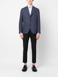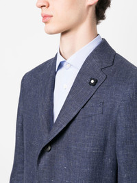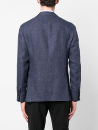 single-breasted blazer Highlights - Blue - Linen-wool blend - Slub texture - Brooch detail - Notched lapels - Front button fastening - Jetted chest pocket - Two front patch pockets - Buttoned-cuff sleeves - English rear vents Made in Italy Composition Outer: Linen/Flax 60%, Wool 40% Lining: Viscose 52%, Cupro 48% SIZE & FIT Model measurements Height 6 ft 3 in(1.91 m) Bust/Chest 37 in(94 cm) Hips 37.79 in(96 cm) Waist 28.34 in(72 cm)