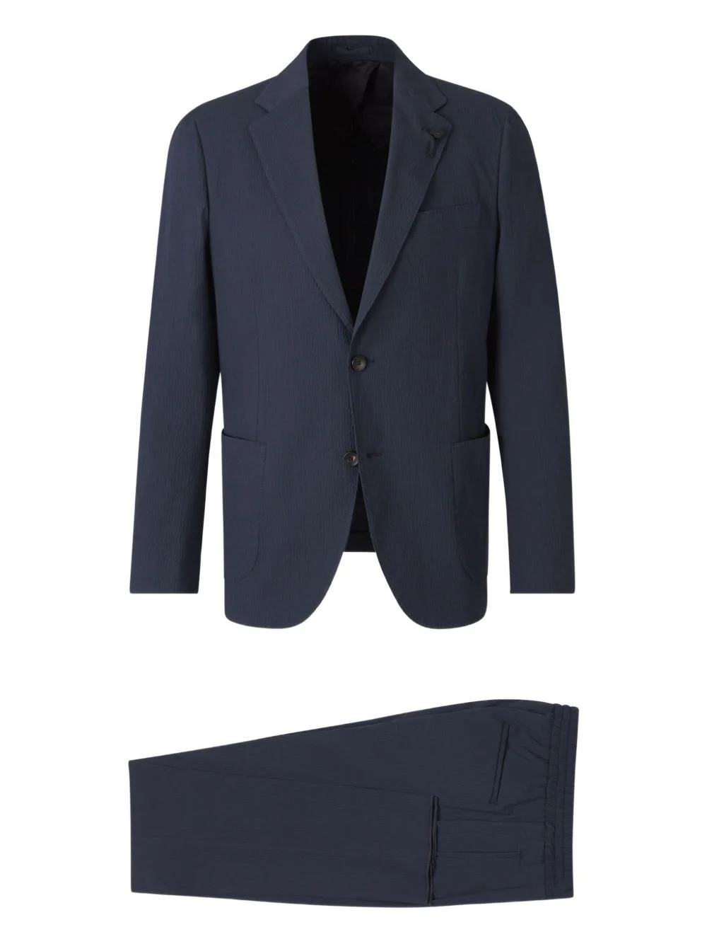 single-breasted suit Highlights - Navy blue - Front button fastening - Elasticated drawstring waistband - Chest welt pocket - Two side patch pockets Made in Italy Composition Outer: Cotton 100% Lining: Viscose 52%, Cupro 48%