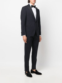 single-breasted two-piece suit navy blue wool blend Blazer: logo plaque peak lapels chest welt pocket two front welt pockets long sleeves buttoned cuffs straight hem Trousers: tailored design two side slit pockets two rear welt pockets belt loops pressed crease straight hem Made in Italy Composition Outer: Polyester 100%, Wool 97%, Spandex/Elastane 3% Lining: Cotton 56%, Cupro 44% SIZE & FIT Model measurements Height 6 ft 2 in(1.89 m) Bust/Chest 37.79 in(96 cm) Hips 37 in(94 cm) Waist 29.92 in(76 cm) FittingInformation This piece fits true to size. We recommend you get your regular size Cut for a slim fit Made with a mid-weight fabric