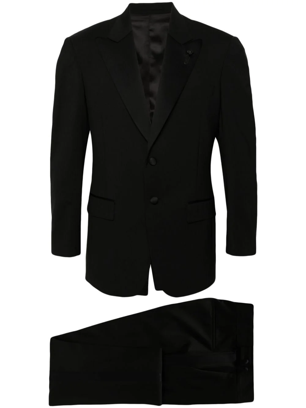 single-breasted wool blend suit Highlights - Black - Stretch-wool - Tailored design - Brooch detail - Dart detailing - Peak lapels - Front button fastening - Shoulder pads - Long sleeves - Buttoned cuffs - Chest welt pocket - Two front flap pockets - American rear vent - Straight hem - Satin lining - Mid-rise - Pressed crease - Off-centre front hook and zip fastening - Two diagonal pockets to the sides - Two rear welt pockets - Straight leg Made in Italy Composition Lining: Viscose 52%, Cupro 48% Outer: Wool 97%, Elastane 3%