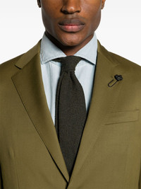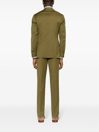 single-breasted wool suit Highlights - Asparagus green - Wool - Brooch detail - Dart detailing - Notched lapels - Front button fastening - Long sleeves with buttoned cuffs - Chest welt pocket - Two front patch pockets - Internal jetted pocket - English rear vents - Curved hem - Partial lining - Mid-rise - Belt loops - Pressed crease - Off-centre front button fastening - Concealed front zip fastening - Two side slash pockets - Two rear button-fastening jetted pockets - Straight leg Made in Italy Composition Lining: Viscose 52%, Cupro 48% Outer: Wool 100% SIZE & FIT Model measurements Height 6 ft 2 in(1.89 m) Bust/Chest 39.76 in(101 cm) Hips 37.4 in(95 cm) Waist 29.92 in(76 cm) FittingInformation Tailored for a slim fit, offering a comfortable fit that sits just away from the body The vented hem offers movement at the rear Made from a midweight non-stretch fabric This piece fits true to size – take your usual size